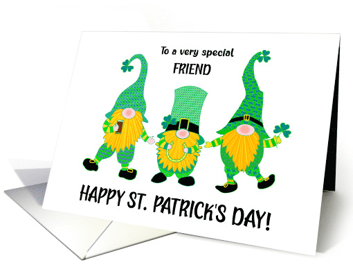 A fun St. Patricks's Day greeting card for your friend, with three jolly, dancing leprechauns. The leprechauns are dressed in shades of green, with black shoes and they all have long, bright, ginger beards. one is carrying a glass of beer, one has a lucky horseshoe and the other one has a large shamrock leaf in his hand. The front cover greeting is, 'To a special FRIEND, HAPPY ST. PATRICK'S DAY!'' and the inside message is just a suggestion, which you can change or delete if you wish.