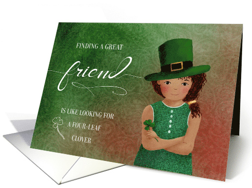 Cute little girl wearing a Leprechaun hat and a green dress, and holding a four-leaf clover on the front of St. Patrick's Day card for a friend.