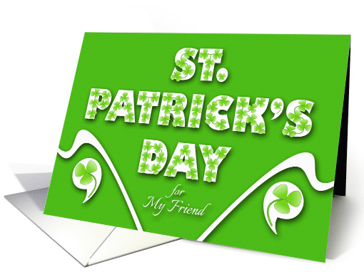 Artist Notes: | St. Patrick's Day for My Friend, paper greeting card in shades of green with bold white letters decorated with delicate shamrocks. Bold white flourishes at the bottom with larger shamrocks. |