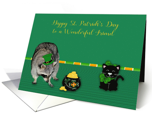 Title: | St. Patrick's Day to Friend, Raccoon wearing a hat with a pot of gold |