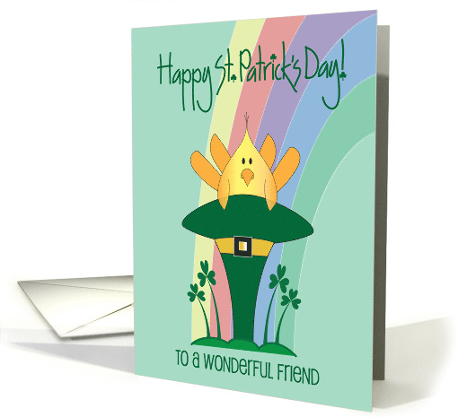 "Happy St. Patrick's Day!" is hand lettered, in bright green, at the very top of this holiday card for a special friend. Crossing the bottom of the card are additional words that say "To a Wonderful Friend". An arching rainbow, with colors of yellow, pink, lavender, blue and green, curves into the green card from the right side, ending behind an upended tall and thin green leprechaun's hat. The hat almost looks like a fountain, as the little yellow bird sits inside of it. Four dark green shamrocks grow around and arch away from the tall hat's base. The inside wording of the card says "Wishing a very special friend a day filled with happiness!"