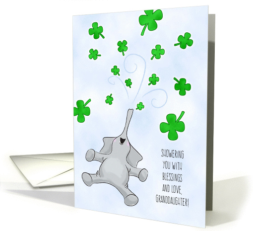 Send St. Patrick's Day love and blessings to your granddaughter with this cute card featuring a joyful gray elephant showering kelly green shamrocks into the air through it's trunk.