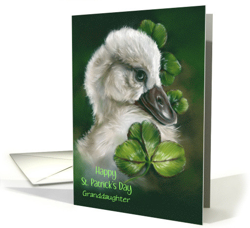 A pretty little baby swan is the subject of bird art in soft pastel hues accompanied by clover on a green backdrop on the front of this Saint Patrick’s Day card that may be customized for a special granddaughter or for anyone.
