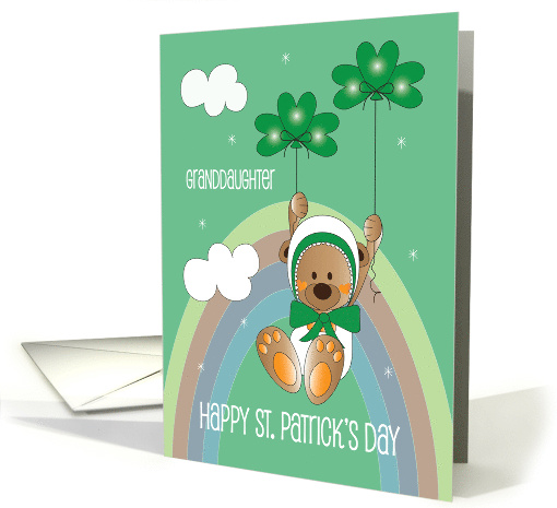 "Happy St. Patrick's Day - Granddaughter" is the fun wording throughout the front of this delightfully fun St. Patrick's card for your Granddaughter. An Irish-bonneted bear, with a huge green bow under her chin, is dangling in the air, beneath two green shamrock balloons and in front of a rainbow. She holds the strings to each in each of her front paws, as she tucks her hind paws up for the ride. The card's inside wording says "Wishing you a bright and happy St. Patrick's Day, sweetheart, with lots of love!"