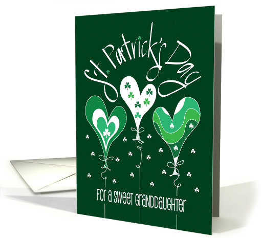 This rich green St. Patrick's Day card brings a cluster of heart-shaped shamrock balloons to your sweet granddaughter for the holiday. They fill the center of the card, showing off their green and white stripes and shamrocks, each with a unique design. Over the top of the curved balloons, white hand lettered wording flows in an arch, with the words "St. Patrick's Day". Below them and tucked into the white balloons strings, additional words say "For a sweet granddaughter". Your inside wording to this special lady says "Happy St. Patrick's Day with lots of love!"
