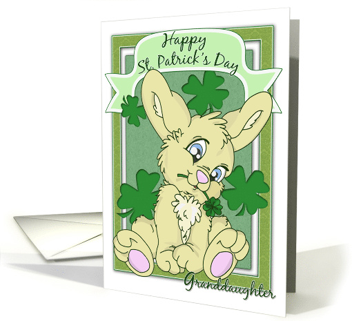 An adorable cartoon of a fluffy and sweet baby bunny sitting with a four lead clover in her mouth is at the front of this card. a few more lucky four leaf cloves adorn the background along with a green patterned frame and a banner across the top that read Happy St. Patrick's Day. Granddaughter text in script is across the bottom