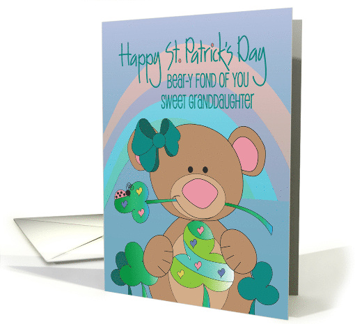 "Happy St. Patrick's Day - Bear-y Fond of You Sweet Granddaughter" is the cute holiday green wording that tops this fun St. Patrick's card for your granddaughter. Below, a delightful brown bear, with a big pink nose and a big green bow on one ear, holds a highly decorated striped shamrock, both in her front paws and one that arches through her mouth. Her pal, the lady bug, sits on the one she has across her face. Behind her, a large pastel rainbow brings good wishes and good luck to your granddaughter, with your card. Colorful hearts of your love decorate some of the card's shamrocks. The inside wording of the card "A St. Patrick's big bear hug and a kiss, with love!"