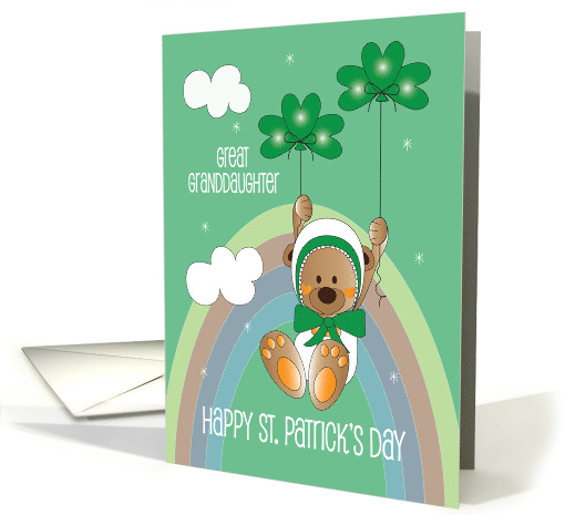 Your Great Granddaughter will absolutely love this adorable little St. Patrick's bear who is all dressed up in her bonnet of green and white, with a huge tied green bow under her muzzle. She is drifting upward, towards the top of the rainbow, as she holds onto two strings attached to two shamrock-shaped balloons above. White clouds and white twinkles brighten the green background, all around her and next to the card's wording that says "Happy St. Patrick's Day - Great Granddaughter". The card's inside wording "Wishing you a bright and happy St. Patrick's Day, sweetheart, with lots of love!"