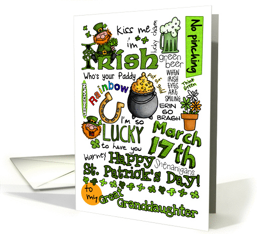 | Artist Notes: | A fun selection of St. Patrick's Day symbols, words and sayings arranged in a trendy "subway art" inspired word cloud on a white background. A playful way to wish your great granddaughter a Happy St. Patrick's Day! |