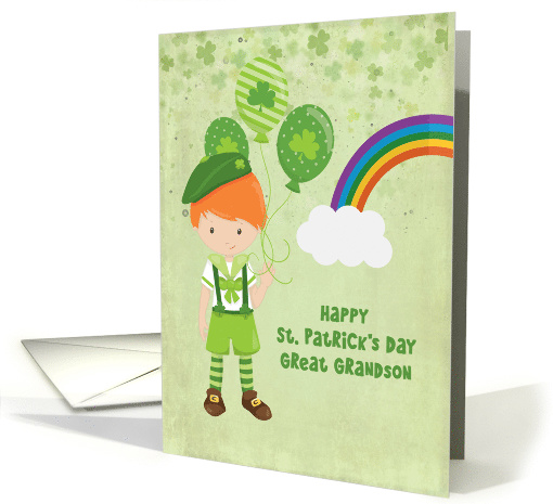 Wish a great grandson a happy St. Patrick's Day with this stylish Irish lad wearing a green outfit and beret and holding three festive balloons with shamrocks. The light green background has a rainbow and scattered shamrocks.