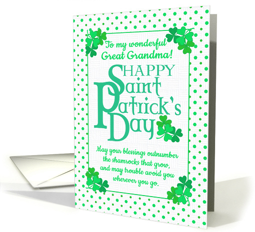 A greeting card for St. Patrick's Day for your great grandmother, with an Irish Blessing. The front cover has a border of polka dots with clusters of shamrocks in each corner. The front cover greeting is, 'HAPPY Saint Patrick's Day' in large green Celtic-style lettering, 'To my wonderful Great Grandma!', and an Irish Blessing down below, in a green handwriting script, all on a lightly textured white background. The inside message is just a suggestion and you can easily change it or delete it if you wish.