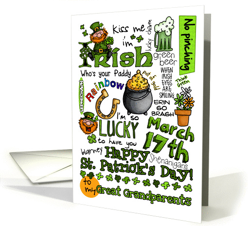 | Artist Notes: | A fun selection of St. Patrick's Day symbols, words and sayings arranged in a trendy "subway art" inspired word cloud on a white background. A playful way to wish your great grandparents a Happy St. Patrick's Day! |