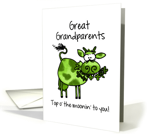 | Artist Notes: | A funny St. Patrick's Day card featuring a bright green Irish cow munching on clover on a white background with the text "Great Grandparents" and "Top o' the moonin' to you!" |