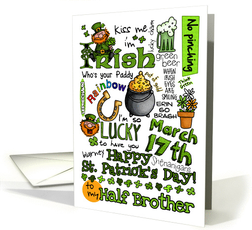 | Artist Notes: | A fun selection of St. Patrick's Day symbols, words and sayings arranged in a trendy "subway art" inspired word cloud on a white background. A playful way to wish your Half Brother a Happy St. Patrick's Day! |