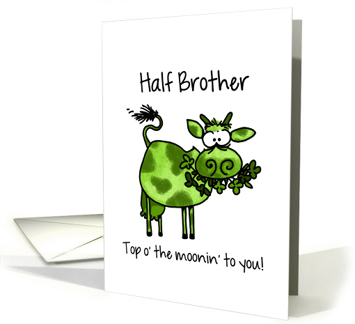 | Artist Notes: | A funny St. Patrick's Day card featuring a bright green Irish cow munching on clover on a white background with the text "Half Brother" and "Top o' the moonin' to you!" |