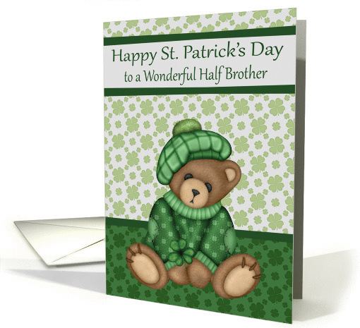 Artist Notes: | Wish your wonderful half brother a Happy St. Patrick's Day with a card featuring a cute bear wearing a sweater and hat on a green with shamrocks background. Inside like all GCU cards can be personalized by you if you wish to give it your own personal touch. Design by Laurie Schneider/Elements by Digital Designs by Elena/Diana'z Designz |
