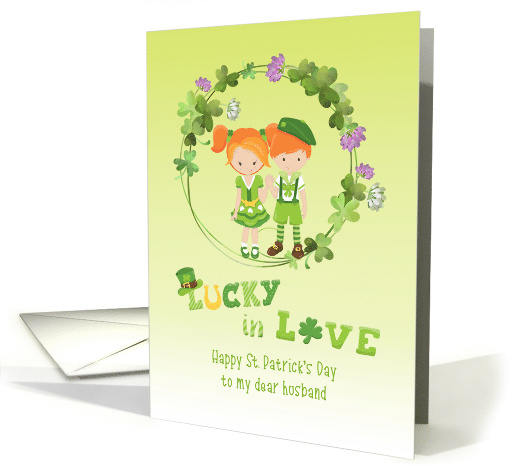 Artist Notes: | A sweet St. Patrick's Day greeting for a husband features a wreath with green clover and purple and white flowers. In the wreath, is a cute couple wearing Irish clothing. There is patterned text that reads "Lucky in Love" with a leprechaun hat over the letter L, a horseshoe in place of the letter U and a 4 leaf clover in place of the letter O. |