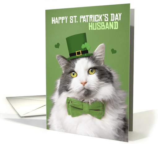Artist Notes: | With a small clover in her leprechaun hat and a matching green bow tie, this adorable kitty cat photographed on a green background is the perfect way to wish your husband a Happy St. Patrick's Day. |