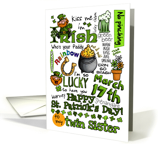 | Artist Notes: | A fun selection of St. Patrick's Day symbols, words and sayings arranged in a trendy "subway art" inspired word cloud on a white background. A playful way to wish your twin Sister a Happy St. Patrick's Day! |