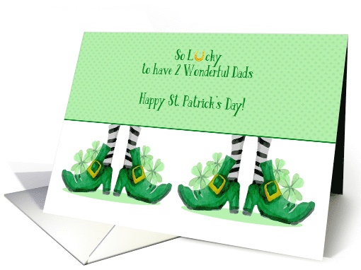 | Artist Notes: | A St. Patrick's Day greeting for a family that has two Dads. This cute card has two pairs of legs and feet with green leprechaun shoes and shamrocks. The top border is green with a shamrock pattern. The word "lucky" has a gold horseshoe in place of the letter "u". |