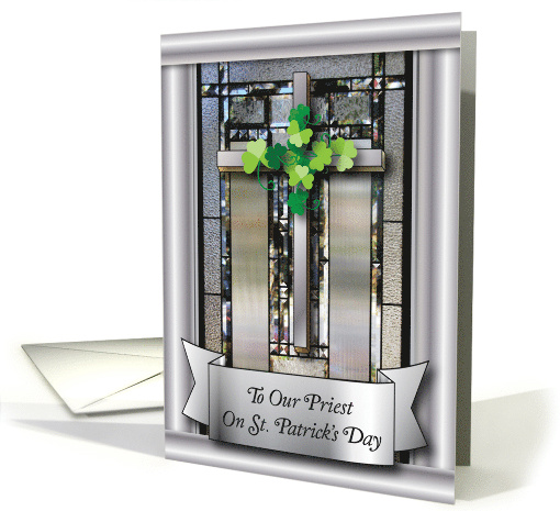 Artist Notes: | This is a St. Patrick's Day card for a priest, featuring a silver cross on a stained glass window, a silver banner, and shamrocks. You may change the inside message at checkout, if you wish. ©Gail Pepin |