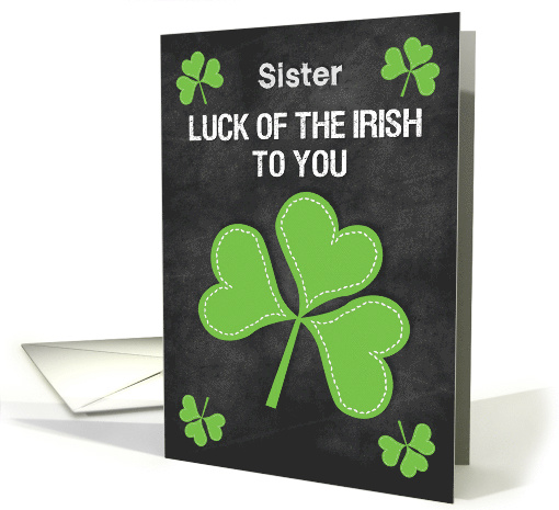 | Artist Notes: | Say Happy St. Patrick's Day to your sister with this design of a big shamrock and little shamrocks on a chalkboard effect background. The front sentiment is "Luck of the Irish to You" and the inside verse is an Irish quote by an unknown author. |