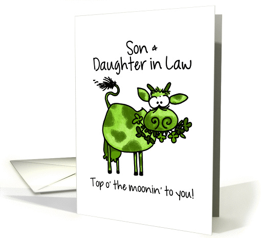 | Artist Notes: | A funny St. Patrick's Day card featuring a bright green Irish cow munching on clover on a white background with the text "Son & Daughter in Law" and "Top o' the moonin' to you!" |