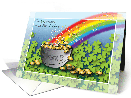 Artist Notes: | Give this St. Patrick's Day card to that special teacher. The cover features a pot of gold, rainbow, rainbow, and a black headline. The inside message may be changed at check out, if you wish. ©Gail Pepin |