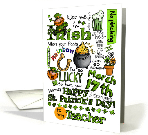 Artist Notes: | A fun selection of St. Patrick's Day symbols, words and sayings arranged in a trendy "subway art" inspired word cloud on a white background. A playful way to wish your teacher a Happy St. Patrick's Day! |
