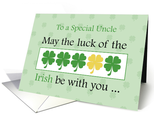 | Artist Notes: | This card with four green clovers and a golden one will bring luck to your Uncle. May the luck of the Irish be with him and all his wishes come true on St. Patrick's Day. He will be delighted to receive your message this way. The gold clover is digitally created. |