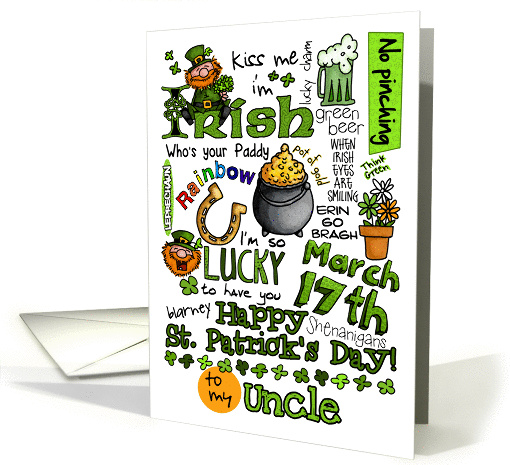 | Artist Notes: | A fun selection of St. Patrick's Day symbols, words and sayings arranged in a trendy "subway art" inspired word cloud on a white background. A playful way to wish your Uncle a Happy St. Patrick's Day! |