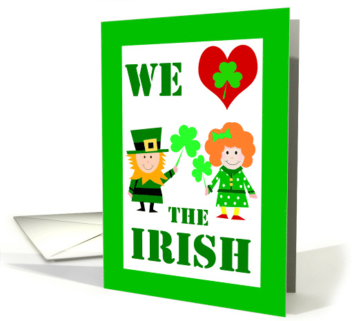 We Heart (Love) the Irish, paper greeting card with cute characters dressed in green attire and holding shamrocks. St. Patrick's Day card from a couple / both of us. Boy and girl courtesy:Clker