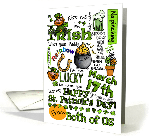A fun selection of St. Patrick's Day symbols, words and sayings arranged in a trendy "subway art" inspired word cloud on a white background. A playful way to wish someone a "Happy St. Patrick's Day!" from the both of you