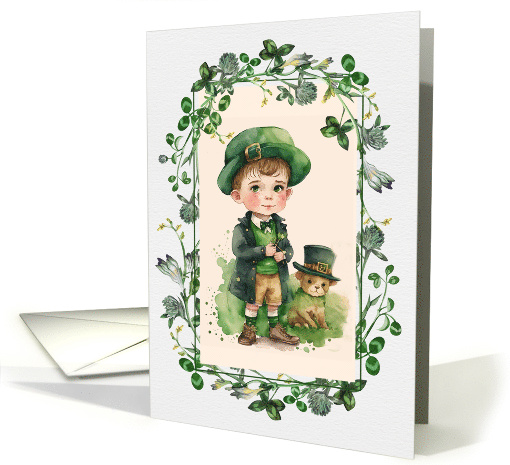 Artist Notes: | Send your love and warm wishes to your family and friends on St. Patrick's Day with this Cute Old-fashioned Little Irish Boy and his puppy design Greeting Card with personalized inside greeting. |