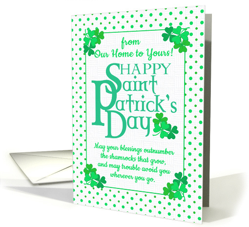 A greeting card for St. Patrick's Day from our home to yours, with an Irish Blessing. The front cover has a border of polka dots with clusters of shamrocks in each corner. The front cover greeting is, 'HAPPY Saint Patrick's Day' in large green Celtic-style lettering, 'From Our Home to Yours!' at the top, and an Irish Blessing down below, in a green handwriting script, all on a lightly textured white background. The inside message is just a suggestion and you can easily change it or delete it if you wish.