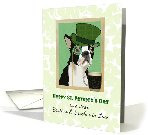 | Artist Notes: | A St. Patrick's Day greeting for a dear brother and brother in law. We have a boston terrier sporting a green hat and a monocle with metallic green frame. To the front is a glass of stout. A lattice work of shamrocks fill the white background. |