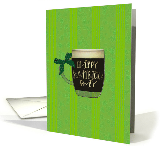 | Artist Notes: | Fun sketch of a pint of delicious stout (dark beer). The pint glass handle is tied with a dark green polka dotted ribbon. Horizontal lime green stripes sit against a patterned leaf green colored background. The Happy St. Patrick's Day greeting is written on the pint glass. |