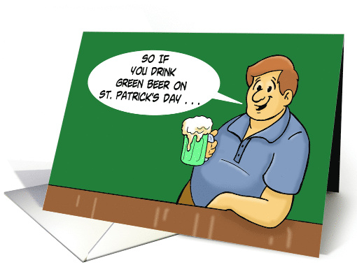 | Artist Notes: | Humorous St. Patrick's Day with a cartoon man holding a glass of green beer. The words say: So if you drink green beer on St. Patrick's Day . . . Inside says: . . . does it count as a vegetable? |
