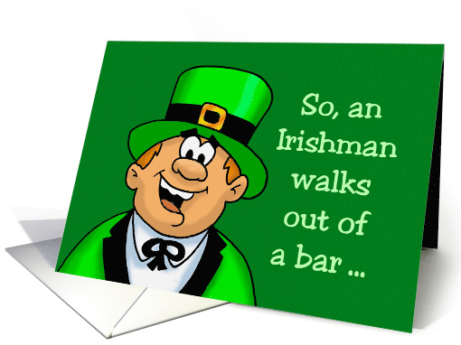 St. patrick's Day card with a cartoon of an Irish man in a costume. The words (he's telling a joke) say, So, an Irishman walks out of a bar ... Inside says, ... nah, just kidding! Happy St. Patrick's Day