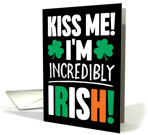 Wish someone a happy St. Patrick's Day with this unique card featuring the message "Kiss Me! I'm INCREDIBLY Irish!" with clover accents on black background. Inside can be customized with your own message. PLEASE NOTE: The word, "INCREDIBLY" uses a distressed grunge-style FONT that is intentional and not a printing error.