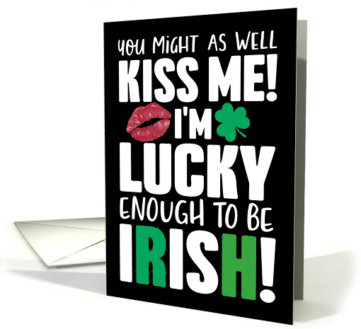 | Artist Notes: | Wish someone a happy St. Patrick's Day with this unique card featuring the message "You might as well KISS ME! I'm lucky enough to be IRISH!" with red lips and clover accent on black background. Inside can be customized with your own message. |