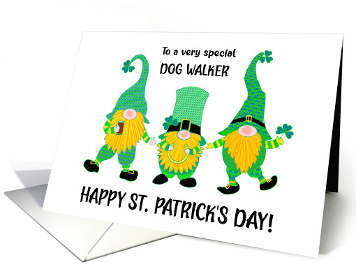 A fun St. Patricks's Day greeting card for your dog walker, with three jolly, dancing leprechauns. The leprechauns are dressed in shades of green, with black shoes and they all have long, bright, ginger beards. one is carrying a glass of beer, one has a lucky horseshoe and the other one has a large shamrock leaf in his hand. The front cover greeting is, 'To a special DOG WALKER, HAPPY ST. PATRICK'S DAY!'' and the inside message is just a suggestion, which you can change or delete if you wish.