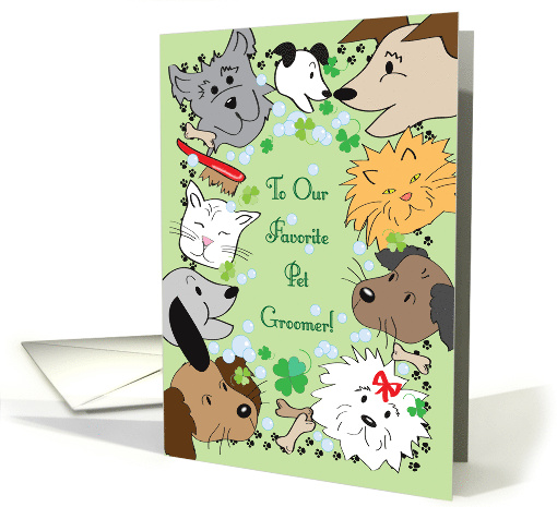 Artist Notes: | Give this fun St. Patrick's Day card to your favorite pet groomer. The card features colorful cartoon cats and dogs, shampoo bubbles, and shamrocks, all on a light green background. The headline is dark green. The inside message may be changed, if you wish. ©Gail Pepin |