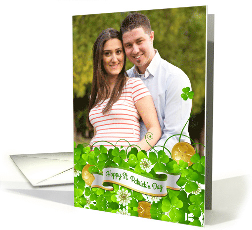 A festive St. Patrick's Day photo card with shamrocks, flowers and gold coins with a banner and Happy St. Patrick's Day text.