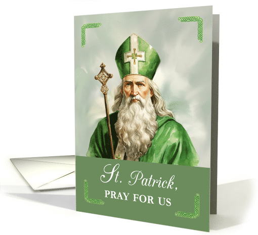 Celebrate the Feast of St. Patrick with this beautifully illustrated card featuring a stunning watercolor portrait of the beloved saint. Dressed in his traditional green robe and mitre, St. Patrick stands with his crozier in hand, symbolizing his role as a shepherd of faith. A soft watercolor background enhances the serene, reverent feel, while intricate Celtic rope knot embellishments in the corners add a distinctly Irish touch. Perfect for sharing blessings of faith, peace, and inspiration, this card is a meaningful way to honor St. Patrick and ask for his intercession.
