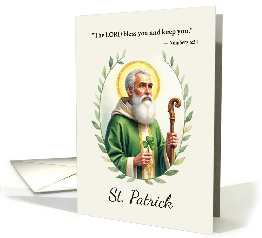 This devotional design features a dignified watercolor-style portrait of Saint Patrick, framed by a soft wreath and filled with gentle Irish symbolism, including his green robe, bishop’s staff, and shamrock. Though often associated with March 17, this card is ideal for sharing spiritual encouragement at any time of year. Whether offering comfort, support, or simply a message of peace, the words inside speak of faith, grace, and God's loving care.