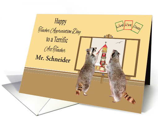 Wish an art teacher Happy Teacher Appreciation Day with a custom name card. There is a large text box on the front for the name of your teacher. An adorable raccoon is painting a lighthouse on a canvas while another raccoon is watching and learning holding a paint palette.