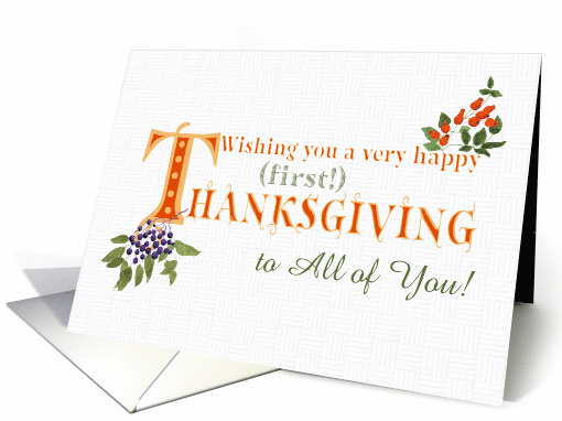 A chic First Thanksgiving greeting card to a whole family or group with word art and hand-painted fall hedgerow fruits, elderberries and rosehips. The front cover greeting is, 'Wishing you a very happy (first) Thanksgiving to All of You!' The capital letter, 'T' is oversized, outlined in gold color and filled with berry red with gold-colored dots. The rest of the lettering is either in red with gold-colored outlines or grey/green to match the leaves of the clusters of berries, all on a lightly textured white background. The inside message can easily be changed or delated altogether if you prefer a 'blank inside' card.