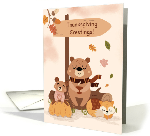 A sweet Thanksgiving card featuring a cozy woodland autumn scene with a bear in a scarf sipping something warm, a fox curled up in the leaves, and a little mouse perched on a pumpkin. The wooden sign reads “Thanksgiving Greetings” for a soft seasonal touch. With gentle fall colors and a cottagecore woodland feel, this card is a thoughtful way to send warm wishes, gratitude, and peaceful comfort at Thanksgiving. Visit my stores for more designs: