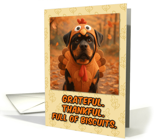 Artist Notes: This heartwarming Thanksgiving card showcases a dog wearing an elaborate turkey costume featuring a hooded design with googly eyes, orange beak, and red wattle. The detailed costume includes layered feather "wings" in various shades of orange and brown, plus a textured chest piece with scale-like patterns. The pup sits against a gorgeous autumn forest with golden foliage. The card has a cream border decorated with delicate leaf motifs. The playful text reads "GRATEFUL. THANKFUL. FULL OF BISCUITS." in bold orange letters with black outlines, perfectly capturing the Thanksgiving spirit with a dog's priorities in mind.